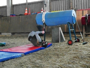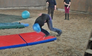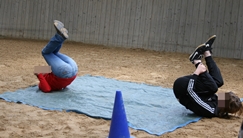 Die neuen Bewegungsabläufe werden ohne Pferd geübt, um die Folgen eines Sturzes durch Abrollen zu minimieren und sich aus dem Gefahrenbereich zu bringen.