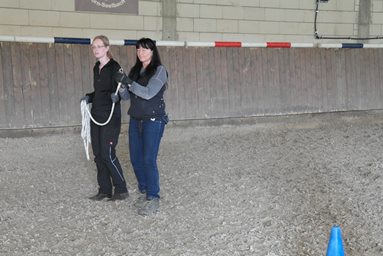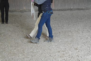 Gar nicht so einfach wie man denkt! Denn dem „Pferd“ begreiflich zu machen was man von ihm will, mit Körpersprache und dem Leitseil, erfordert eine gewisse Reaktionsschnelligkeit, Koordination und Körperspannung. Und da ist schon der ein oder andere Knoten in Armen und Beinen sowie im Leitseil entstanden. Denn „Oberschwung“ und „Unterschwung“ will gelernt sein!