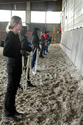 Nach der Mittagspause ging es dann ans „Leitseil“. Das Leitseil hat in der TGT - Methode eine sehr große Bedeutung. Man beginnt mit dem „Führen auf Distanz“, bei dem man das Pferd mittels Leitseil und Körpersprache auf einer kurzen Distanz führt, anhält und wendet.