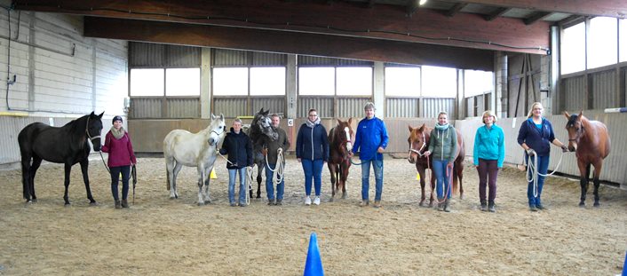 Wir trafen uns um 9.00 Uhr im Seminarraum der Reitanlage in Herborn. Wir waren eine große Truppe, da neben den praktizierenden Teilnehmern noch zwei Zuschauerinnen dabei waren. Bei der Vorstellungsrunde stellten wir fest, dass wir eine sehr gemischte Truppe mit Ponies (alle Pferde sind für mich Ponies Julia hatte eine sehr gute und für jedermann verständliche Theorieeinheit zum Thema vorbereitet. Bei Kaffee und Kuchen hörten wir sehr interessiert zu und stellten natürlich so einige Fragen. Nun ging es zunächst für alle Zweibeiner in die Halle. In Zweiergruppen aufgeteilt und mit Leitseil bewaffnet „spielten“ wir Mensch und Pony. Das Pony hatte die Augen verschlossen und musste ohne Stimme mit dem Leitseil geführt werden. Schritt, Anhalten und Volten sollten mit dem Leitseil dirigiert werden. Das war gar nicht so einfach Nach der Partnerübung erlernten wir den Ober- und Unterschwung mit dem Leitseil und vor allem auch die „richtige Dosierung zu pendeln“. Das People-Training ist zur Übung sehr gut, da die Handhabungen mit dem Leitseil anfangs meist sehr unkoordiniert sind Nach dieser Einheit wurden wir in zwei Gruppen eingeteilt, die nacheinander die Einheiten bestritten. So konnte man auch bei der anderen Gruppe zuschauen, was so manche Aha-Effekte hatte. Zunächst wurde „nur“ am Halfter geführt. Hört sich leicht an – ist es aber nicht. Von beiden Seiten, immer mit Schulterkontrolle, zum richtigen Zeitpunkt die Hilfe geben und den eigenen Körper richtig einsetzen. Es wurden Ovalbahnen, Volten und Übergänge eingebaut. Wichtig war es immer wieder so zu führen, dass die Schulterkontrolle vorhanden war, d.h. ich steuere das Pony mit der passenden Hilfengebung am Halfter zum richtigen Fußabtritt. Nachdem das alles soweit klappte, tauschten wir Halfter gegen Knotenhalfter und Leitseil. Die soeben gut gemeisterten Übungen wiederholten wir nun mit dem Knotenhalfter und Leitseil auf kurzer Distanz. Die Ponies reagierten sehr gut, viel schneller als mit dem Halfter und wieder mussten wir unserer eigenen Körperhaltung bewusster werden. Nachdem alle Teilnehmer diese Einheit gut überstanden hatten ging es zunächst einmal in die Mittagspause. Bei Pizza, Salat, etc. redeten wir uns über da Thema TGT® und welche Erkenntnisse wir aus den ersten Einheiten mitnehmen. Nach der Mittagspause ging es weiter mit der Leitseil Arbeit. Die Halle wurde in 3 Teile geteilt und jeder hatte seinen Bereich. Zuerst wiederholten wir die Übungen auf kurzer Distanz um das Gelernte zu festigen. Dies klappte überraschend schnell. Nun ging es weiter zur mittleren Distanz und wir schickten das Pony zuerst mit einer Distanz in dem Rechteck. Wir „versuchten“ das Pony stehenzulassen und die Richtungen zu wechseln. Die Hauptfehler bestanden in dem „zu Bodenschauen“, der „unruhigen oder verkrampften treibenden Hand“ und „der falschen Körperhaltung“. OH WEH – das konnte ja noch heiter werden. Die Ponies blieben oft stehen und schauten uns verunsichert an. Julia schaute sich jedes Paar individuell an und gab Hilfestellung bis es funktionierte. Dem einen musste mehr Takt vorgegeben, dem anderen den richtigen Zeitpunkt angesagt, dem nächsten die Ruhe gegeben werden… Nun wurden verschiedene Hindernisse wie das Kleeblatt, Slalom, Stangen und eine Box aus Softstangen aufgebaut. Im Rotationsverfahren bewältigten wir die Hindernisse und es machte unglaublich viel Spaß. Anscheinend hatten wir doch Einiges mit unseren Ponies erarbeitet. Am Schluss waren wir doch alle glücklich und stolz auf uns und die Ponies! Bericht: Maya Sturm |