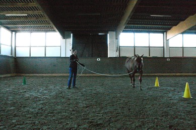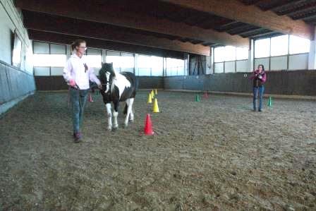 Julia stellte uns anschließend in interaktiver Form die Theorieeinheit vor: von der Grundarbeitshaltung bei dieser Methode, über die Relevanz und den Einsatz der Körpersprache, bis hin zur Anwendung der Methoden. Die vier Bereiche der Bodenschule bestehen aus dem Führtraining, der Arbeit am Leitseil und an der Hand mit einer Touchiergerte und Desensibilisierungsmethoden.