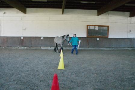 Die erste Praxiseinheit fand ohne Pferd statt. Im "People-Training" übten wir die richtige Körperhaltung, sowie Führpositionen und des Weiteren den präzisen und bewussten Umgang mit dem Leitseil. Dabei erlebten wir uns nicht nur in einer aktiv führenden Position, sondern auch als Geführter - und somit in der Position des Pferdes.