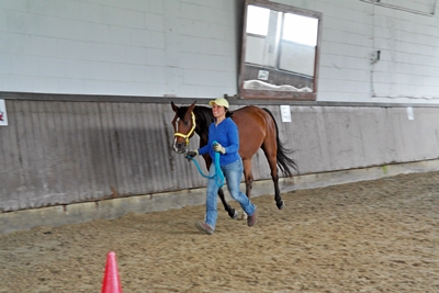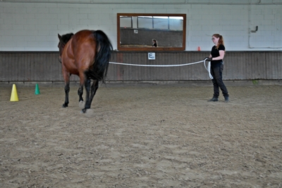 Dann ging es erstmal mit dem Leitseil an die Trockenarbeit – Oberschwung, Unterschwung - wir sollten erst mal ein Gefühl fürs Seilschwingen erhalten, sowohl mit der linken als auch mit der rechten Hand, damit wir nicht durch unkoordiniertes oder hektisches Schwingen die Pferde komplett verwirren. In der TGT Methode wird (zunächst nur) mit dem Seilende als „ Meinungsverstärker“ gearbeitet – im Basiskurs brauchten wir weder Gerte noch Stick.