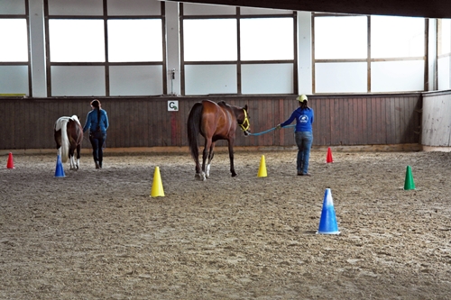 Wir bekamen von Julia zunächst einfachere, dann schwierigere Führaufgaben gestellt, die sie uns vorab mit einem der Pferde demonstrierte. Vor allem kam es darauf an, die Hilfen, was man vom Pferd möchte, möglichst FEIN zu geben und nicht unkontrolliert am Strick zu rupfen.